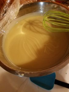 Alternate between using the stick blender in short bursts and stirring to create an emulsion. It will not take long to reach the stage called “light trace.” Trace is when the mixture has a consistency like pancake batter. When you drizzle or drip some of the mixture on the surface of the rest of it, it stays on the surface instead of sinking in. That is, you can see the trace of where it was drizzled. If the stick blender is used more, the mixture will become thicker and stiffer, achieving a thicker level of trace. If you keep you mix at light trace it will be easier to pour.