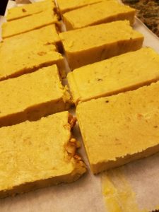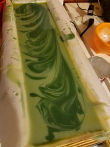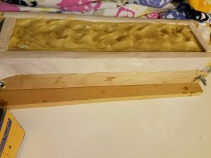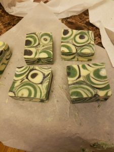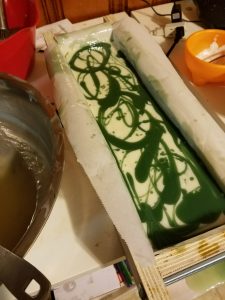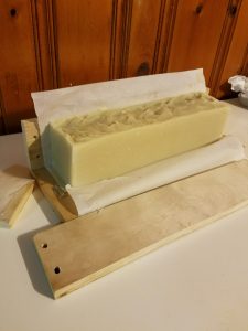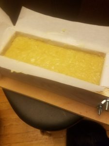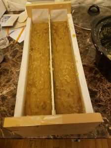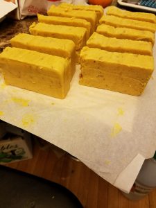 Pour your mixture into a load mold and allow it to cure for at least 24 hours. Remove from mold and cut into bars. Place bars in a safe dry place and allow to dry and harden for 4-6 weeks before use. It is common for cold process soap bars to develop a thin layer of soda ash as a by-product of saponification. To avoid this, people often spray their bars with isoprophyl alcohol at the time of cutting. It your soap gets soda ash, you can easily remove it by quickly dipping each bar in water and patting them dry with a paper towel. It is important to wear rubber or nitrile gloves when doing this. Without gloves, you may leave fingerprints on your soap or oil from you hands may leave a visible residue on the soap.