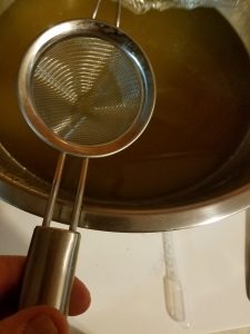 At this point, remove it from the heat. Keep it covered and allow it to cool. When it reaches 120 degrees Fahrenheit, it should be safe to add the essential oils. Spend a few minutes blending the oils in with the whisk to make sure they are fully incorporated.