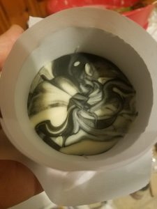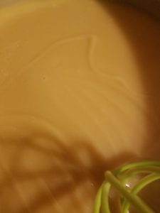 Alternate between using the stick blender in short bursts and stirring to create an emulsion. It will not take long to reach the stage called “light trace.” Trace is when the mixture has a consistency like pancake batter. When you drizzle or drip some of the mixture on the surface of the rest of it, it stays on the surface instead of sinking in. That is, you can see the trace of where it was drizzled. If the stick blender is used more, the mixture will become thicker and stiffer, achieving a thicker level of trace. If you keep you mix at light trace it will be easier to pour.